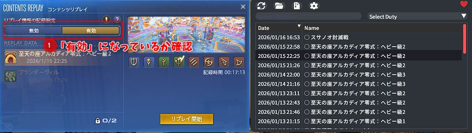 ①まず最初に「有効」にしておかないとリプレイが保存できません。