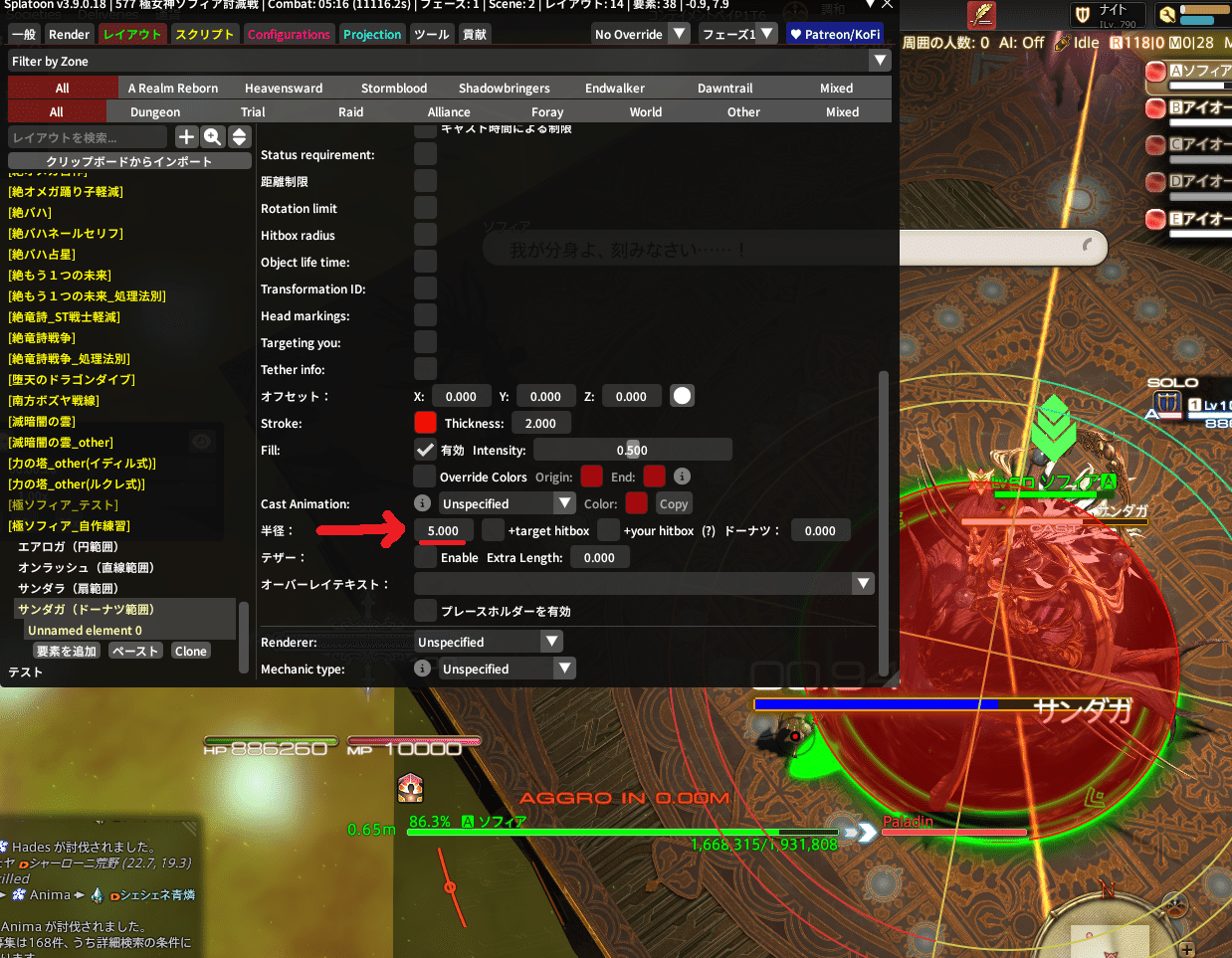 タゲサのサイズは『5m』なので、『半径』には『5』と入力!