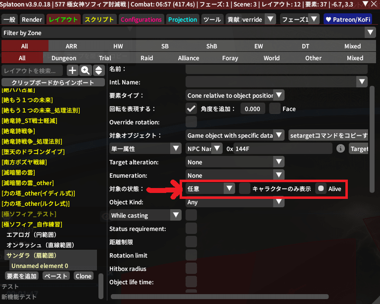 『対象の状態』について、ここはおおむね『キャラクターのみ表示』にチェック入れるだけでうまくいくことがほとんどだよ。