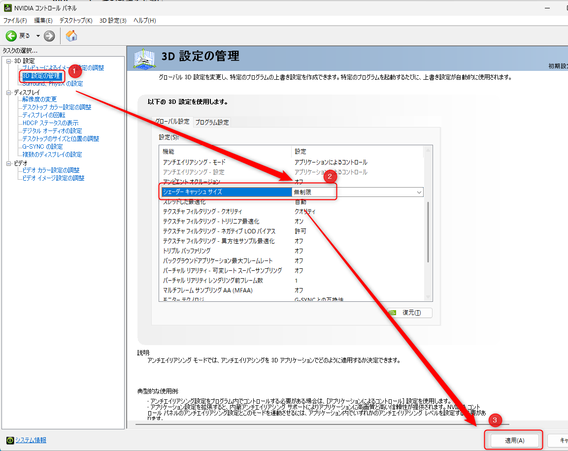 3D設定の管理>シェーダー キャッシュ サイズ>無制限